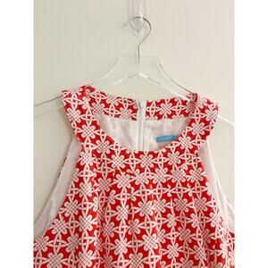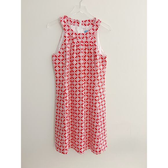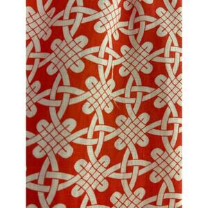 J McLaughlin linen dress features red/orange and white celtic knot pattern, shift silhouette, and halter neckline. Fully lined. Knee length.