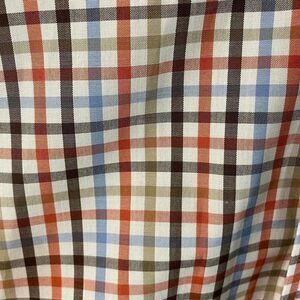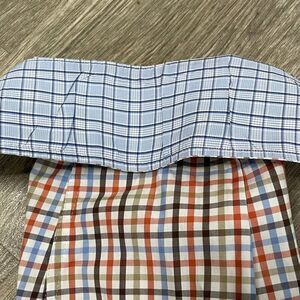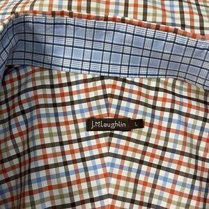Men’s plaid J. McLaughlin button down shirt. 100% cotton. Collar and and cuffs have contrasting fabric on the inside. Shirt is in good condition, no stains or tears. Size large.
