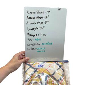 Across Bust: 17", Across Waist: 15", Across Hips: 19", Length: 35"