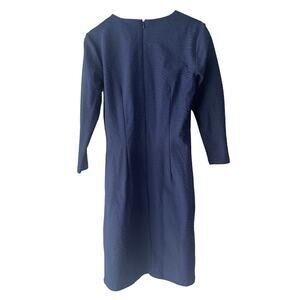 Elevate your wardrobe with this elegant J.McLaughlin Sophia Dress in navy Radio Waves Jacquard fabric. Designed with a flattering silhouette, this timeless piece features 3/4 sleeves, a back zip closure, and a textured jacquard finish that adds sophistication and style. Perfect for work, dinner, or any special occasion.