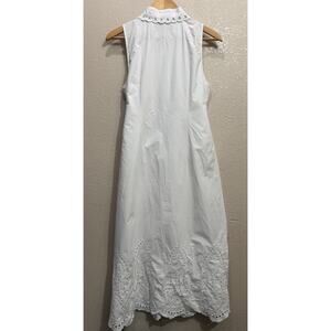 The J.McLaughlin White Solid Anka Embroidered Midi Dress in size L is a stylish and versatile piece perfect for various occasions such as Holy Communion, parties, or casual wear. Made from 100% cotton, this sleeveless dress features intricate embroidered accents and a flattering fit & flare style. The white color and solid pattern make it a classic choice for the summer, fall, and spring seasons. Perfect for women looking for a chic and elegant dress option from a trusted brand like J. McLaughlin.