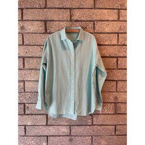 J.McLaughlin Womens Seersucker Button-Down Shirt L Striped Aqua White Cotton Rel