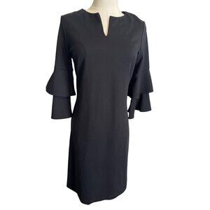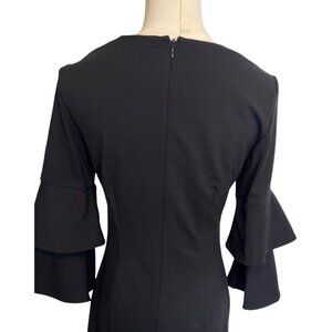black dress, bell sleeve dress, J.McLaughlin dress, women's XS dress, professional dress, elegant black dress, rayon blend dress, semi-formal dress, chic black dress, ruffle sleeve dress, stylish black dress, fitted dress, office wear, gala, date night, business function, dinner date, classy, sophisticated, corporate attire, artsy, pretty, modern elegance, romantic evening, Cocktail Dress, Evening Attire, Little Black Dress, LBD, Party Dress, Day to Night, Wedding Guest, Work Event, networking dress, excellent condition