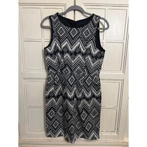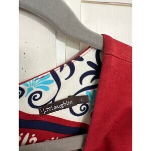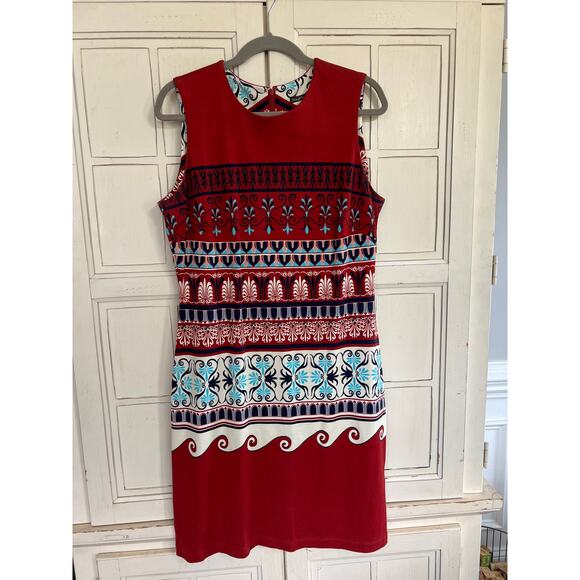 J. McLaughlin size large sleeveless knit dress in excellent condition. Zips in the back. Paprika color with blues and beige. Measures 20” from armpit to armpit. 17 1/2” across the waist and it is 39” long.