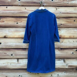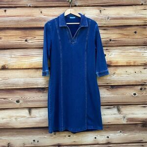 Knit Stretch Denim Dress V neck Collared neck 3/4 sleeves Princess seams Cotton and spandex Machine washable