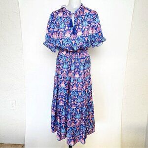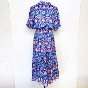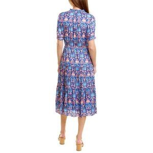 Chessie Silk-Blend A-Line Dress in blue & multicolor with mandarin collar, elasticized cuffs, and tiered