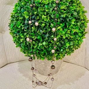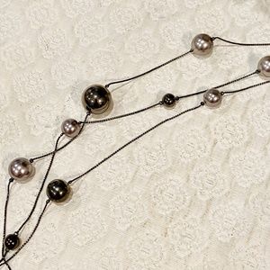 -Three gunmetal colored chains with Gunmetal & silver/gray(like pearls) of varying sizes interspersed.Lobster claw clasp