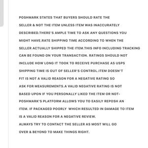 -I PLACE MUCH IMPORTANCE ON BUYERS WHO HAVE PREVIOUSLY PURCHASED FROM ANY BUYER ON POSHMARK AND LEFT A RATING & LOVE NOTE! I CHOOSE TO WHOM I WILL SELL.REVIEW MY NUMEROUS FEEDBACK RECEIVED FROM MY VALUED CUSTOMERS