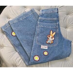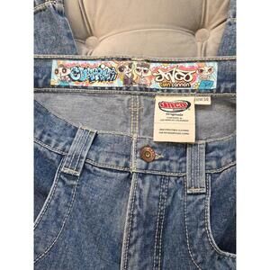 A JNCO classic in Original Dark Stone Wash W101 Twin Cannon Womens Jeans Tag Size 32 x 34.