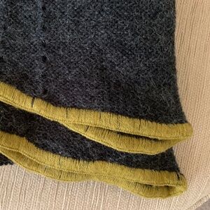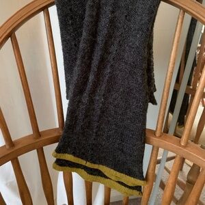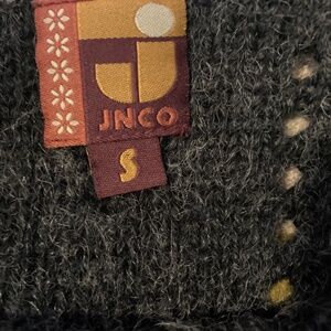 Authentic vintage JNCO fuzzy knit sweater in charcoal gray with mustard trim. Features soft brushed texture, open-stitch detailing, and wide bell sleeves for a classic Y2K grunge vibe. Lightweight yet warm — perfect for layering with cargos or denim.