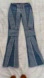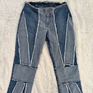 Stylish patchwork flare jeans with a unique design. Features shades of blue and white accents.