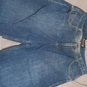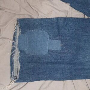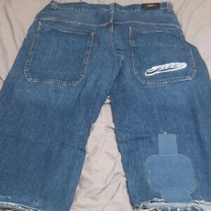 fair condition, with significant wear on the bottoms of the legs, along with patches applied to a tear, as both pictured. the legs have been shortened & hemmed to a 22" inseam (meant to be worn real baggy). waist size is 42". overall length from top of waistband to bottom of legs is 38.5". y2k style.