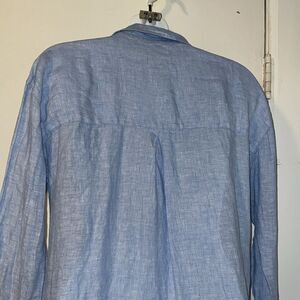 100% linen in a light blue color with a slight crosshatch woven design, button up, fold over collar, button cuffs, patch pocket at each hip, 14” slit up each slide for movement. Machine washable. Excellent condition. Size small, measures 20” from armpit to armpit and 35” from