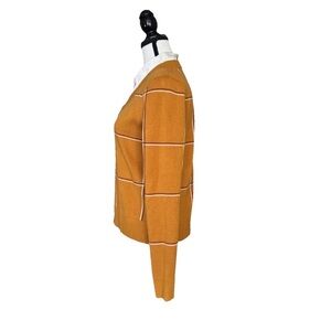 This Jones New York women's sweater is a pullover style with a V-neck and a built-in blouse. The sweater is gold/mustard color with a windowpane grid pattern in white and brown. The blouse is a solid white
