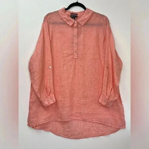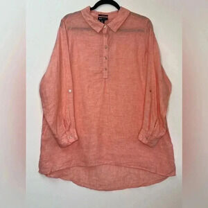 JNY Jones New York Women Sz 1X 100% Linen Roll Tab Sleeves Tunic Top Coral Peach
