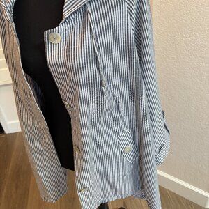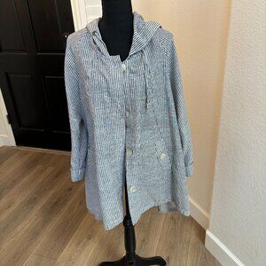 Black and white stripe linen hoodie. Can be worn as a jacket (buttons down front) or a top. Cute cuffs and back detail!