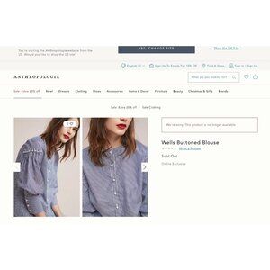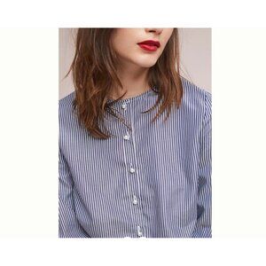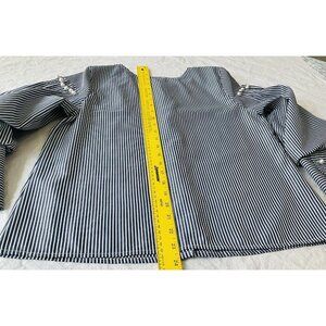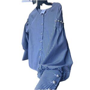 JOA Anthro Top Pearl Buttoned Blouse Blue Pinstripe Puff Balloon Sleeves Small