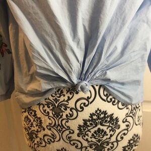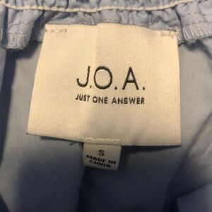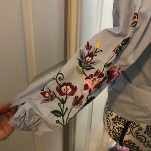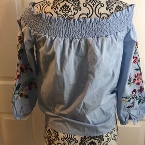 JOA Blouse Embroidered Blue Stretch Off Shoulder Tie S