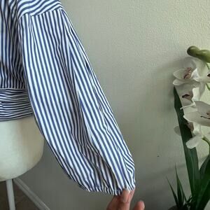 J.O.A Blue White Striped Tie Blouse Puff Sleeve Button Up Minimalist Women's M