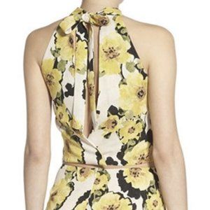 Ties at the neck in the back. Has two buttons at the bottom that snap together. Can wear without snapping buttons. Excellent condition.