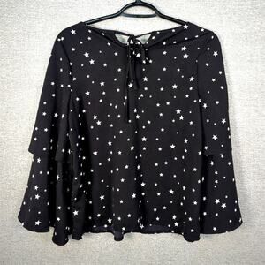 JOA J.O.A. BLACK STAR PRINT BELL RUFFLE SLEEVE BLOUSE SHIRT SZ S