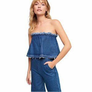 Keywords: J.O.A. Los Angeles, denim jumpsuit, strapless, blue denim, trendy, chic, versatile, casual, evening wear, festival fashion, LA style, women's jumpsuit, fashion-forward, contemporary, comfortable.