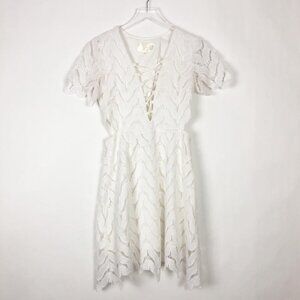 J.O.A Laced Up Cutout Waist Tiered Hem Crochet Mini Dress. White. Size S