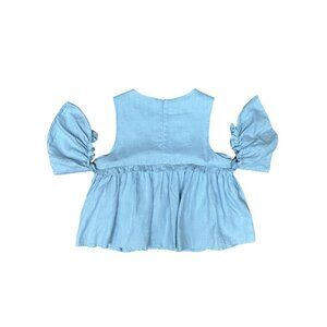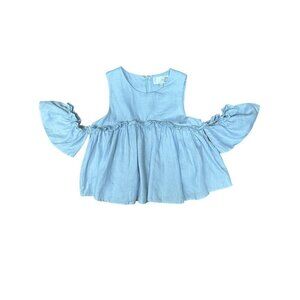 This J.O.A. Los Angeles layered ruffle cold shoulder top in a light blue/Chambray shade, is crafted from 100% linen. It fits a size small, featuring an elegant, airy design perfect for summer.