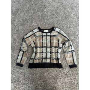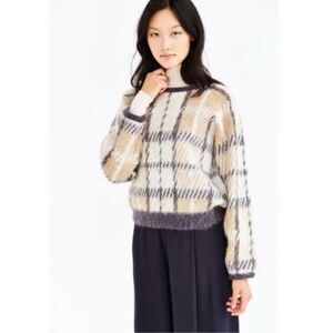 J.O.A. Natural Cozy Plaid Pullover Sweater Fuzzy Mohair Wool Checked Boxy Medium