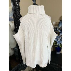 Made of 70% acrylic and 30% polyester. Loose cable knit with turtleneck and bare shoulders. Laying flat measures 23" from pit to pit and 27" from shoulder to the hem.