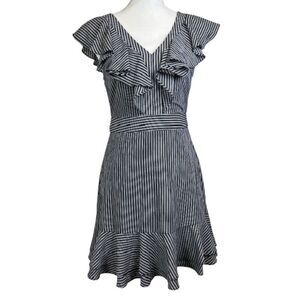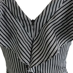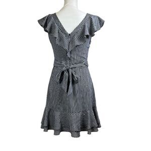 J.O.A. Ruffle Midi Dress Just One Answer Black and White Striped Lined Tie Waist. Tie waist bow can go in front or back. Zipper back, ruffle hem and sleeves / neckline. Very flattering, flowy, and fun. Great for summer, vacation, beach, graduation, party, date night. JOA Los Angeles Excellent like new condition.