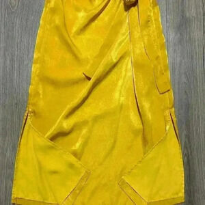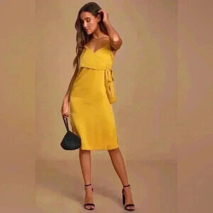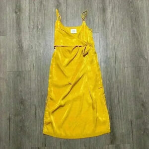 Sleek satin falls from adjustable spaghetti straps, into a wrapping, surplice bodice that ties at the waist. Sheath skirt, with side slits, falls to a midi hem. Fit: This garment fits true to size. Length: Knee to mid-calf length. Size small measures 39.5in from adjustable straps to hem. Bust: Great for any cup size. Waist: Not Fitted - comfortable room throughout midsection. Hip: Not Fitted - room for hips. Undergarments: May be worn with a strapless bra, adhesive bra, petals, or no bra. Fabric: Fabric has no stretch. Bodice is lined. 100 percent Polyester. Hand Wash Cold. Imported.