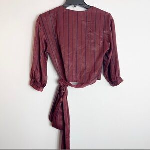 Stunning top in wine/burgundy color with navy stripes... Feels like satin, but texture looks like silk.