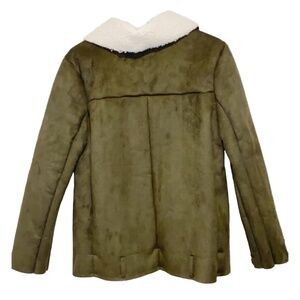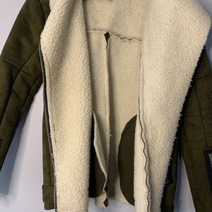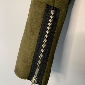 J.O.A Suede Vacation Shearling Jacket in Olive. size MEDIUM. The Suede Vacation jacket by J.O.A. comes in army green and features a moto jacket silhouette, full shearling lining, black zip pocket and sleeve detailing, front zip closure, and suede grommet belt. Perfect over a ribbed turtleneck, moto pants, and ankle boots.