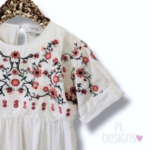 J.O.A. White Swiss Dot Cotton Boho Floral Embroidered Baby Doll Tunic Top