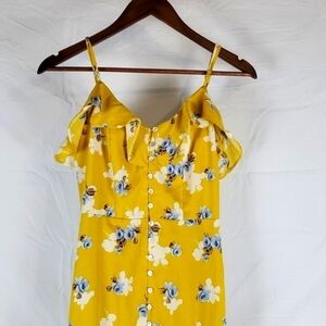 J.O.A Los Angeles floral print button down maxi dress in yellow multi. Spaghetti straps. Ruffle at neckline. Button front. Side zipper closure. Smocked back. Great condition. Size small.