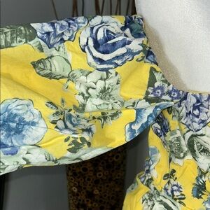 Step into style with this J.O.A. sundress, featuring a charming off-the-shoulder neckline and playful puff sleeves. The vibrant yellow and blue color palette, combined with ruffled and smocked details, makes it an ideal choice for wedding guests or a night out. Its mini length and light fabric ensure a breezy, elegant look for any warm-weather occasion.