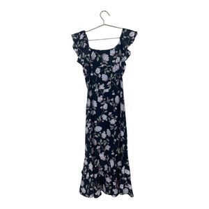 Spend long days and warm nights in the J.O.A. Eugenia Black Floral Print Off-the-Shoulder Midi Dress! This sleek woven dress, with a moody purple, white, and green floral print, boasts a ruffled, off-the-shoulder neckline (with elastic), and princess-seamed bodice, supported by adjustable skinny straps. Fitted waist falls into a figure-skimming midi skirt with a tiered, ruffle-trimmed hem. Hidden back zipper/clasp.