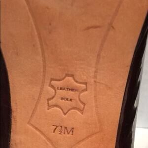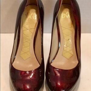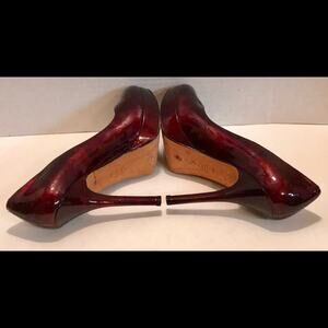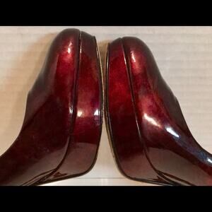 Rounded toe on 3/4โ patent platform in warm rich merlot burgundy color ...cushioned interior footbed, heel in EUC, tapered patent approx. 5โ heel, normal wear years of life ahead, a great color a great comfy shoe ๐๐๐