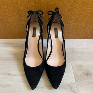 Dajora black high heels with ankle bow and cut-out detail from Joan & David. Bought from Nordstrom. Good used condition, there is wear to the leather sole and a little bit of dirt from being worn on a lawn, I will try to clean that off before shipping. Perfect for a wedding, cocktail or black tie occasion!