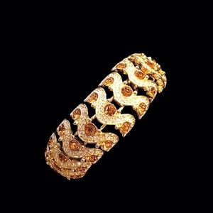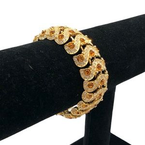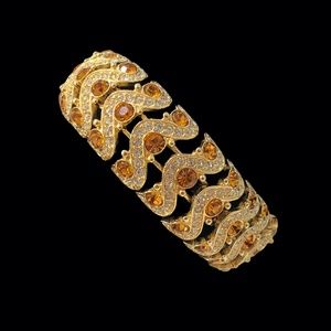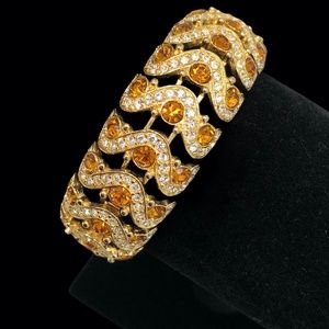 Vintage Joan Rivers Amber & Clear Crystal Gold Tone Bracelet in excellent preowned condition. The serpentine design features waves of clear crystals with large amber stones in rows. The clasp has 3 small clear crystals.
