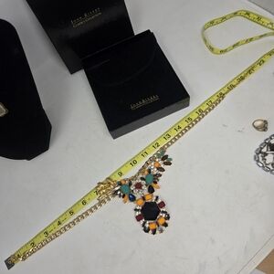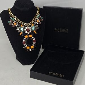 The JOAN RIVERS Collection Statement Necklace with Multi Colored Rhinestones is a stunning piece of vintage-inspired statement jewelry. It features a flower pendant shape with green, orange, blue, amber, smoky quartz and turquoise rhinestones. The goldtone/brass metal, adjustable closure, and lobster clasp ensure both style and comfort. Signed by the brand, this statement necklace is a beautiful addition to any jewelry collection with a touch of art-inspired flair.