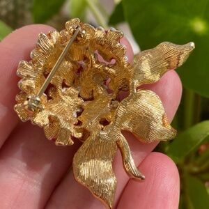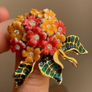 This exquisite Joan Rivers brooch showcases vibrant red, pale yellow and green enamel accents. The rich colors are beautifully complemented by a polished gold-tone base, making it a standout decorative piece for any occasion. Measurement shown in photo. In excellent condition. Smoke-free home.