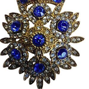 This rare Joan Rivers Royal Monarch Maltese Cross Brooch is one of her most coveted collector’s pieces, produced in limited quantities in the 1980s–1990s as part of her Classics Collection. The dimensional design features sapphire blue rhinestones, ruby red accents, and clear crystal detailing set in rich gold tone filigree metalwork. The crowned Maltese cross motif evokes vintage royal regalia — a dazzling statement piece embodying Joan Rivers’ signature blend of elegance and theatrical glamour.