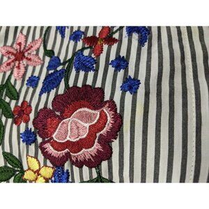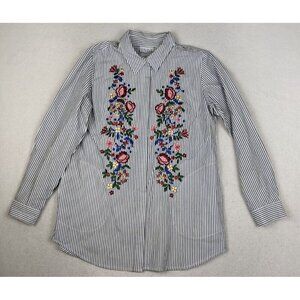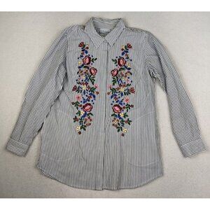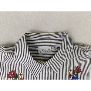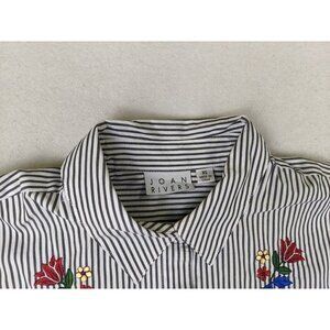 JOAN RIVERS - WOMEN'S GRAY & WHITE STRIPED FLORAL EMBROIDERED BUTTON-UP TOP - XS