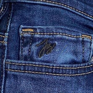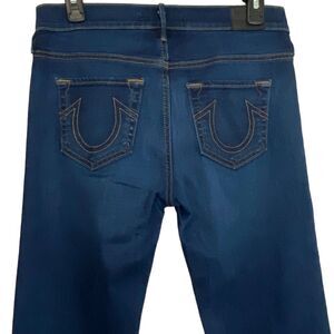 • Dark wash. Has the traditional True Religion logos. On front - has a silver tone metal piece and on the back pockets, you will see the TR stitching