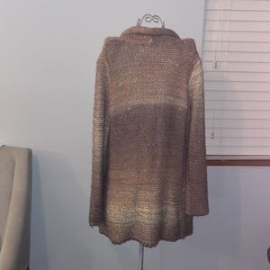 Joan Vass size large, long line, Cardigan, brown cream, gray with metallic, threading excellent condition.