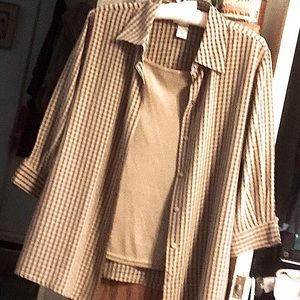 Lightweight polyester summer blouse with inlaid shirt to allow buttons open or buttoned up to any length. Stylish sleeve length just below elbows. This is size small. The color is burnt brown over light brown. Easy care. No iron.No tears or signs of wear. Well cared for.