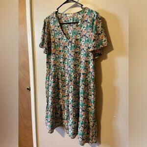 JODIFL Floral Teal/Pink Short Flutter Sleeve Dress Button Front Tiered Small