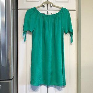 JODIFL green floral embroidered tunic. Size Small. Short sleeves with tie. 100% rayon. Elastic neckline. Measures 19" across chest and 30" long. Good condition.